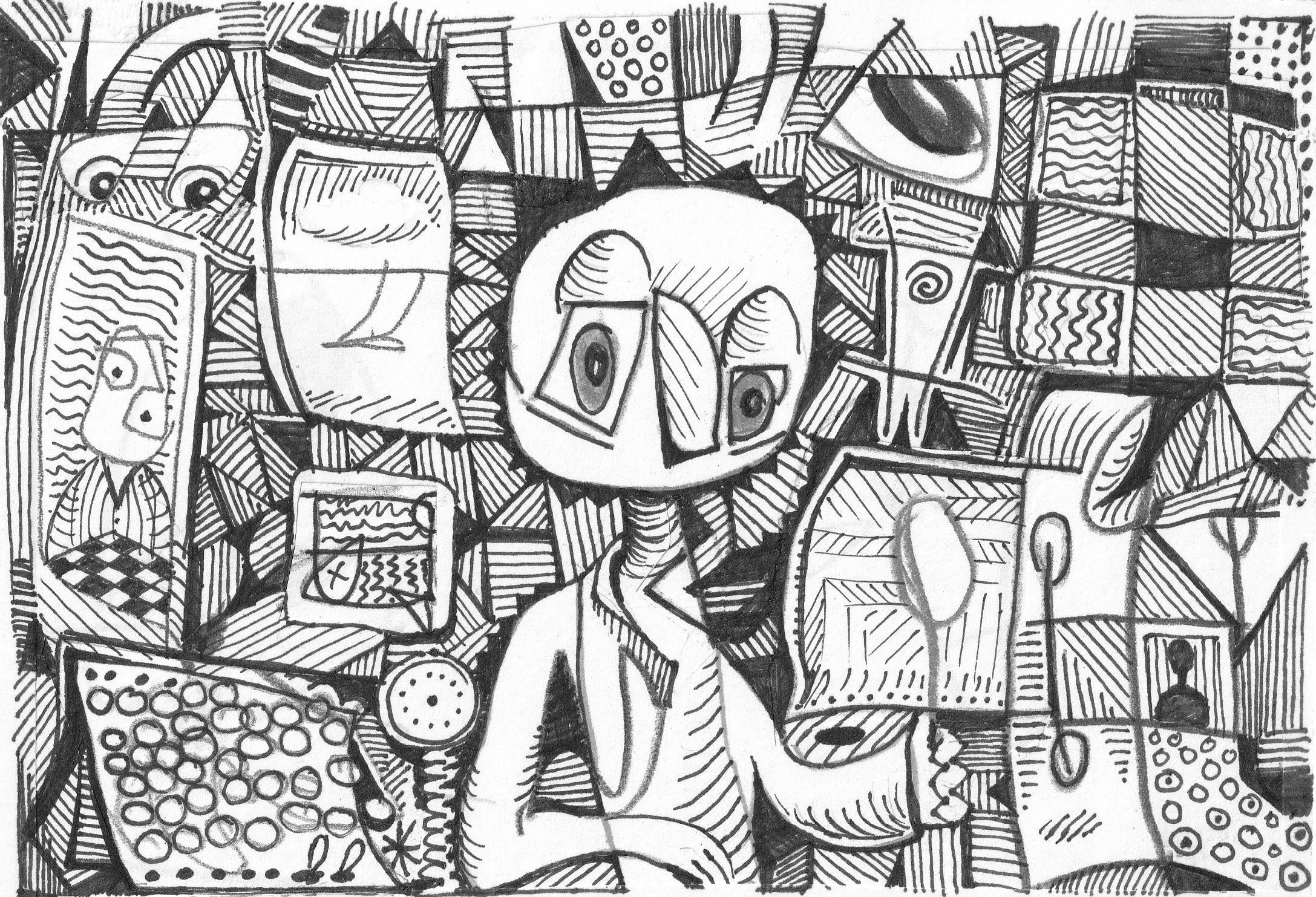 As a subcontractor for the American government’s intelligence agencies, N.O. Probity obsessed over the enigma of Sam Bored. Why was this local artist on his radar screen, or television monitor to be exact? Noel pushed the record button; he planned to review this video footage later tonight after the gallery event. The time and date are displayed on the video tape machine: 04:40 02 20 1991. Noel had begun to collect a whole library of Sam Bored clips. When one looked closely without blinking, there was often a moment when Sam seemed to go out of focus – just for a second or two. At first Noel ignored that part of the video tape and rationalized it as just electronic interference. But he had now come to realize it happened on nearly all the video recordings of Sam playing chess at the coffeehouse. Noel is currently obsessed with this phase shifting anomaly that Sam displays while in deep thought.